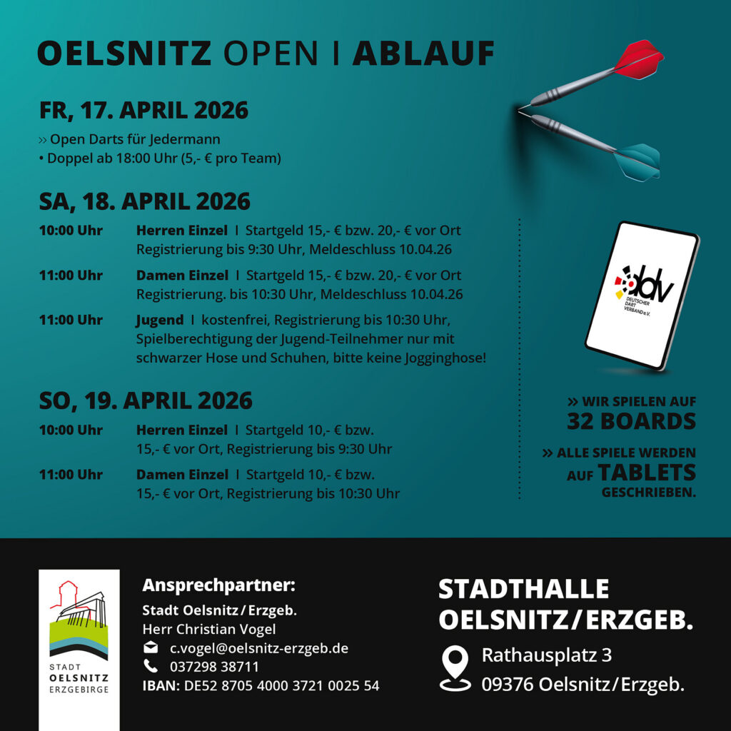 DDV-Ranglistenturnier Oelsnitz OPEN Tilo 2 April, 2026 1 Minute gelesen Anmeldelink: https://2k-dart-software.com/frontend/events/10/registration/57/register Beitragsnavigation Zurück: Andy`s Sommerliga 2026 – Anmeldung läuftWeiter: FAIRPLAY – ENJOY.RESPECT Verwandte Geschichten Andy`s Sommerliga 2026 – Anmeldung läuft Tilo 2 April, 2026 Neue Homepage Tilo 2 April, 2026